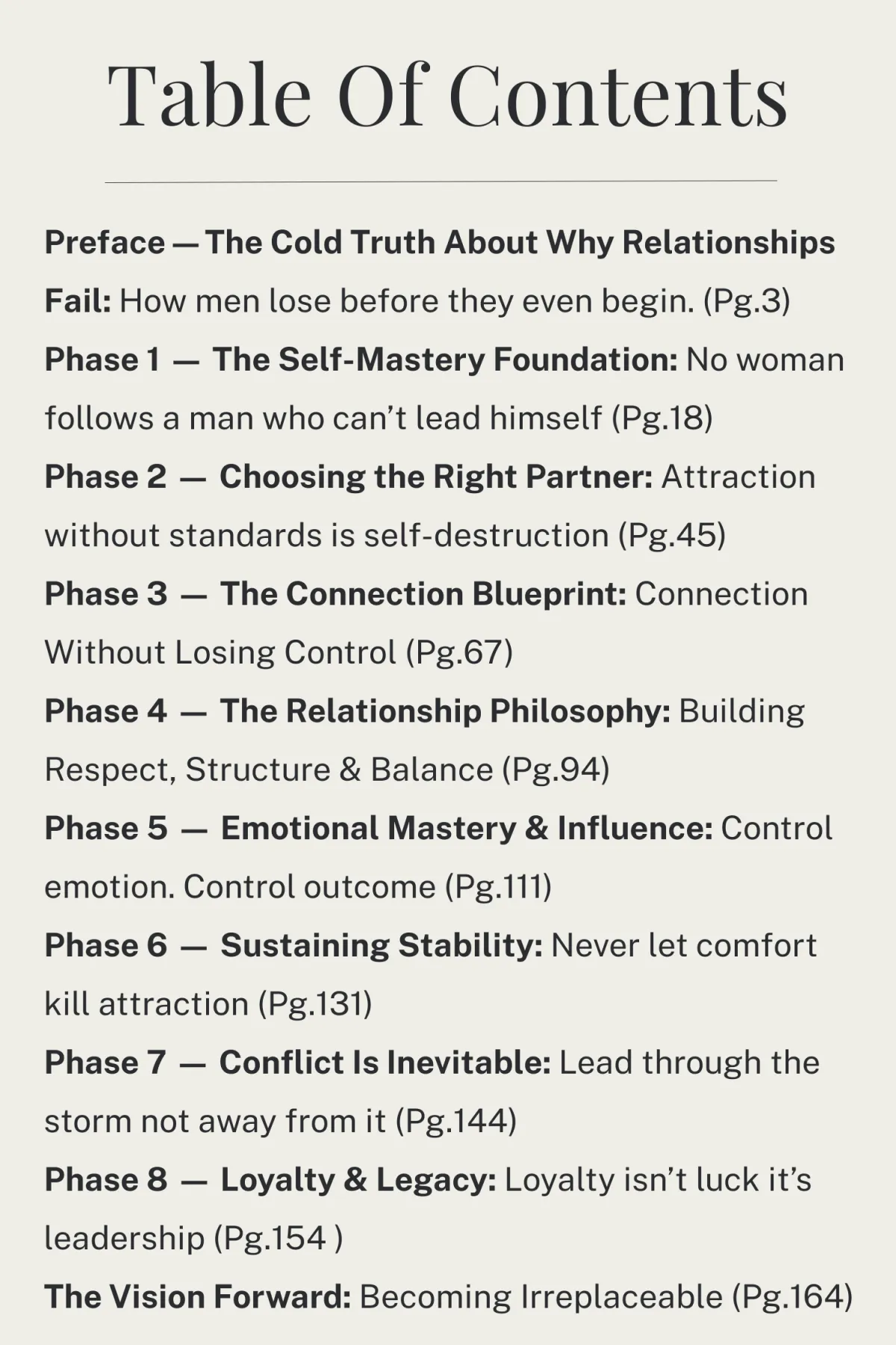Unlike typical dating “advice” that teaches surface tricks or emotion-based reactions, this system gives you the internal structure to dominate every stage: self-mastery, attraction, connection, leadership, and long-term stability.